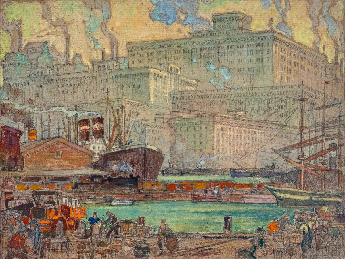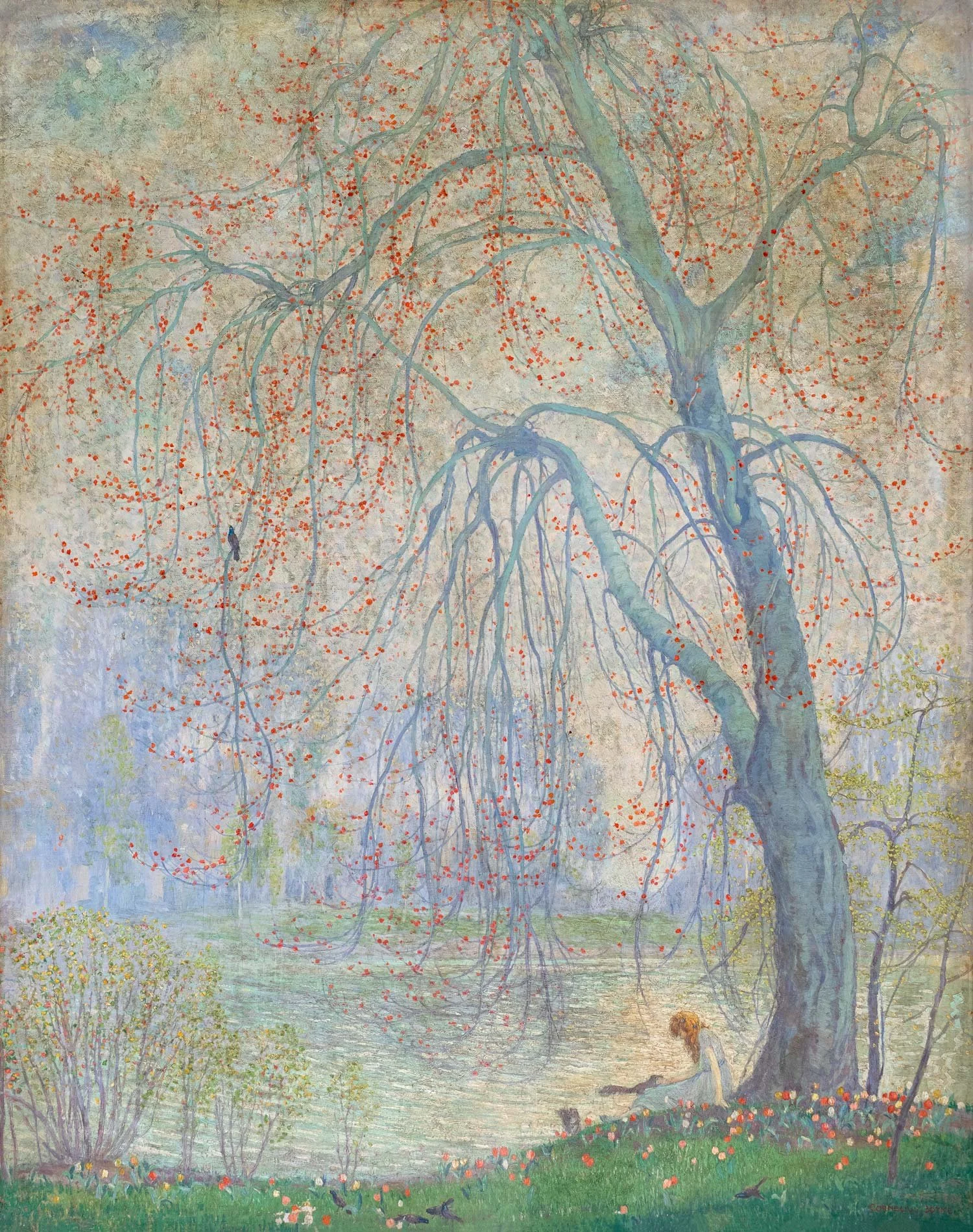 In 1906, Botke emigrated to the United States, joining his cousin’s architectural firm in Kenosha, Wisconsin. A year later he moved to Chicago and worked as an architectural renderer. Determined to pursue painting, he spent much of his paycheck on art supplies and studied at night at the Art Institute of Chicago. Through mutual friends he met fellow artist Jessie Arms in 1914. The two married just six months later and completed their first large-scale mural commission together before even taking a honeymoon—the first of many collaborations during their marriage.