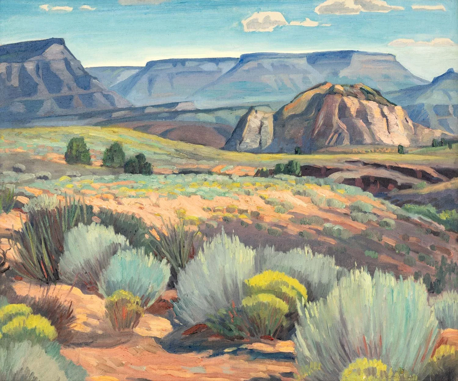 In 1931, Los Angeles Times art critic Arthur Millier described Cornelis as a “kind-eyed, methodical Dutchman…[who] painted the landscape in a charming, decorative manner, romantic and colorful.” Botke’s landscapes, seascapes, and still lifes were widely recognized for their bright, clear, and joyous color. His training in architectural drawing is evident in much of his work, though as another reviewer observed, “It takes a poet to build up from architectural rendering to such lyrical conceptions.”
